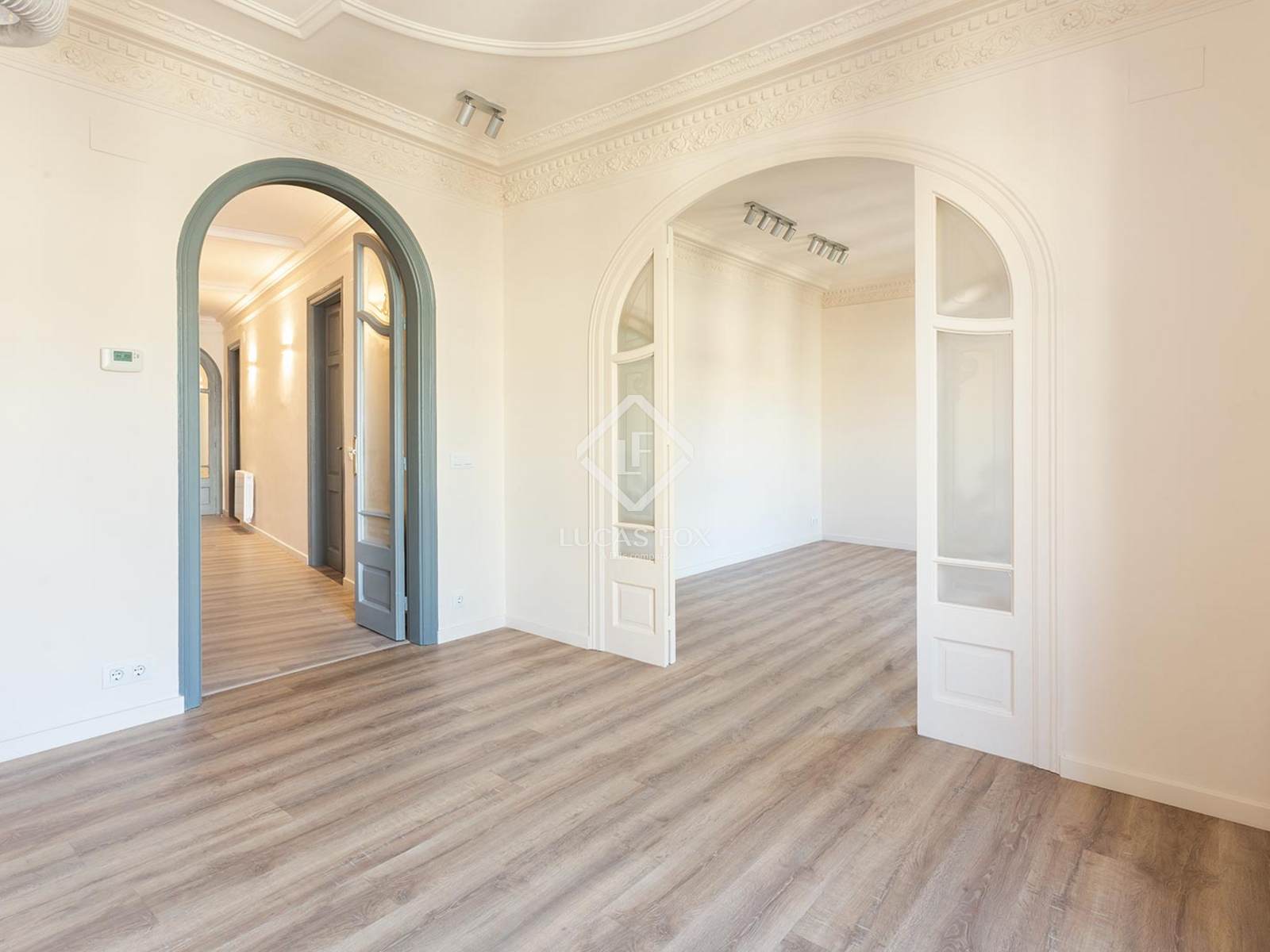 El pis es presenta amb una reforma d'alta qualitat en què s'han combinat els elements originals, recuperats i conservats amb molta cura, amb un disseny d'interior modern. Així doncs, s'ha creat un pis meravellós d'estades àmplies i lluminoses de sostres alts que gaudeix d'un estil actual i sofisticat sense renunciar a l'estil regi de l'edifici.