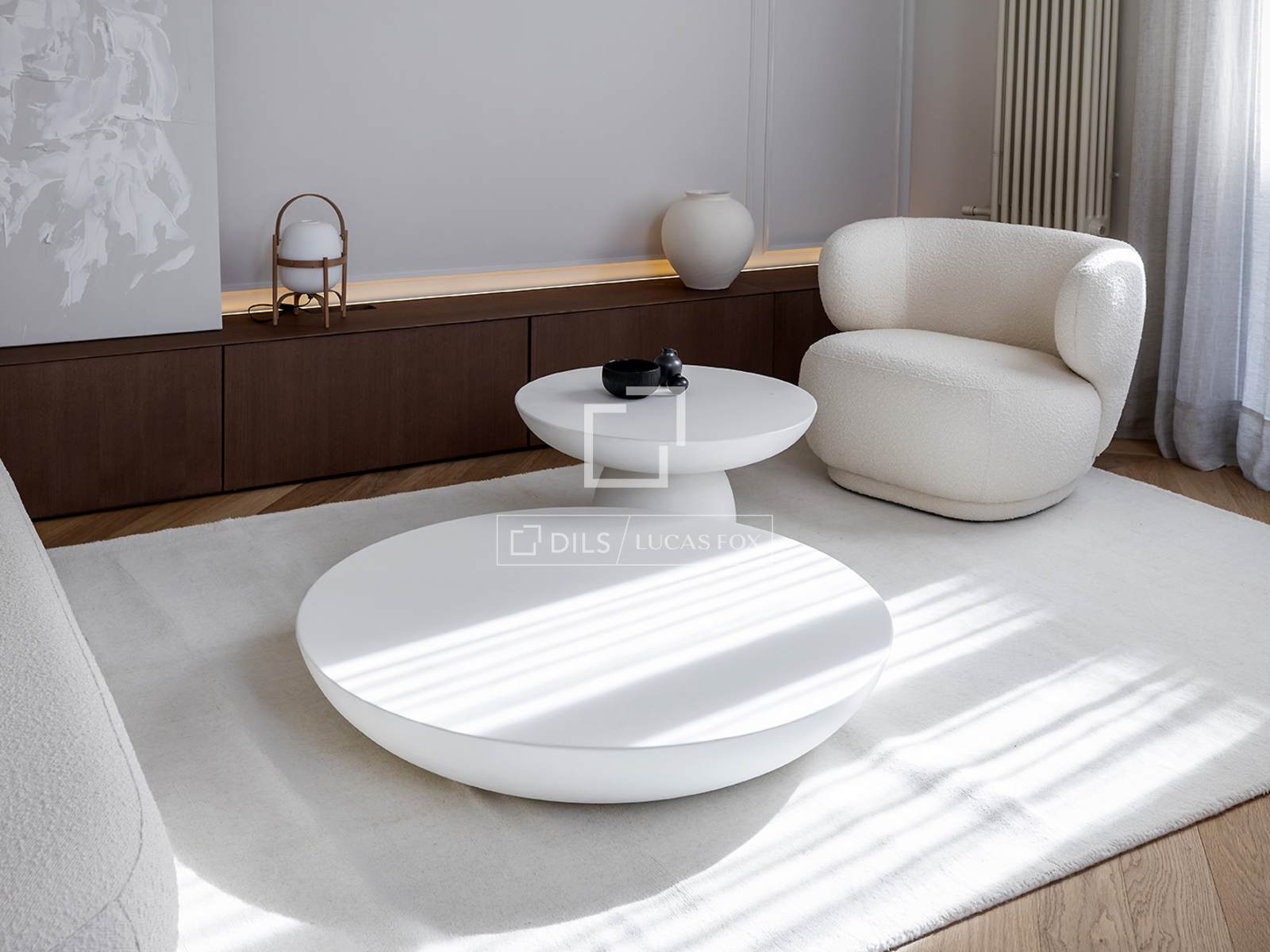 A la zona de menjador, l'elegància continua amb una taula de pedra travertí orgànica, envoltada de cadires de fusta fetes a mà i il·luminada per l'escultural làmpada DOT de Norman Foster. Els detalls de roure ben pensats realcen l'ambient refinat de tot l'espai.