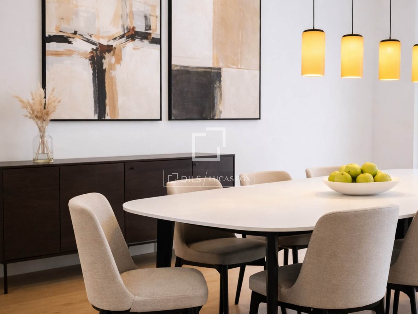 Des d'aquí, a la dreta, l'apartament s'obre a una impressionant sala d'estar i menjador de 48 m², un espai elegant i de proporcions generoses dissenyat tant per a la vida quotidiana com per a l'entreteniment. L'escala d'aquesta sala permet zones de saló i menjador clarament definides, mantenint alhora una sensació d'obertura i flux.