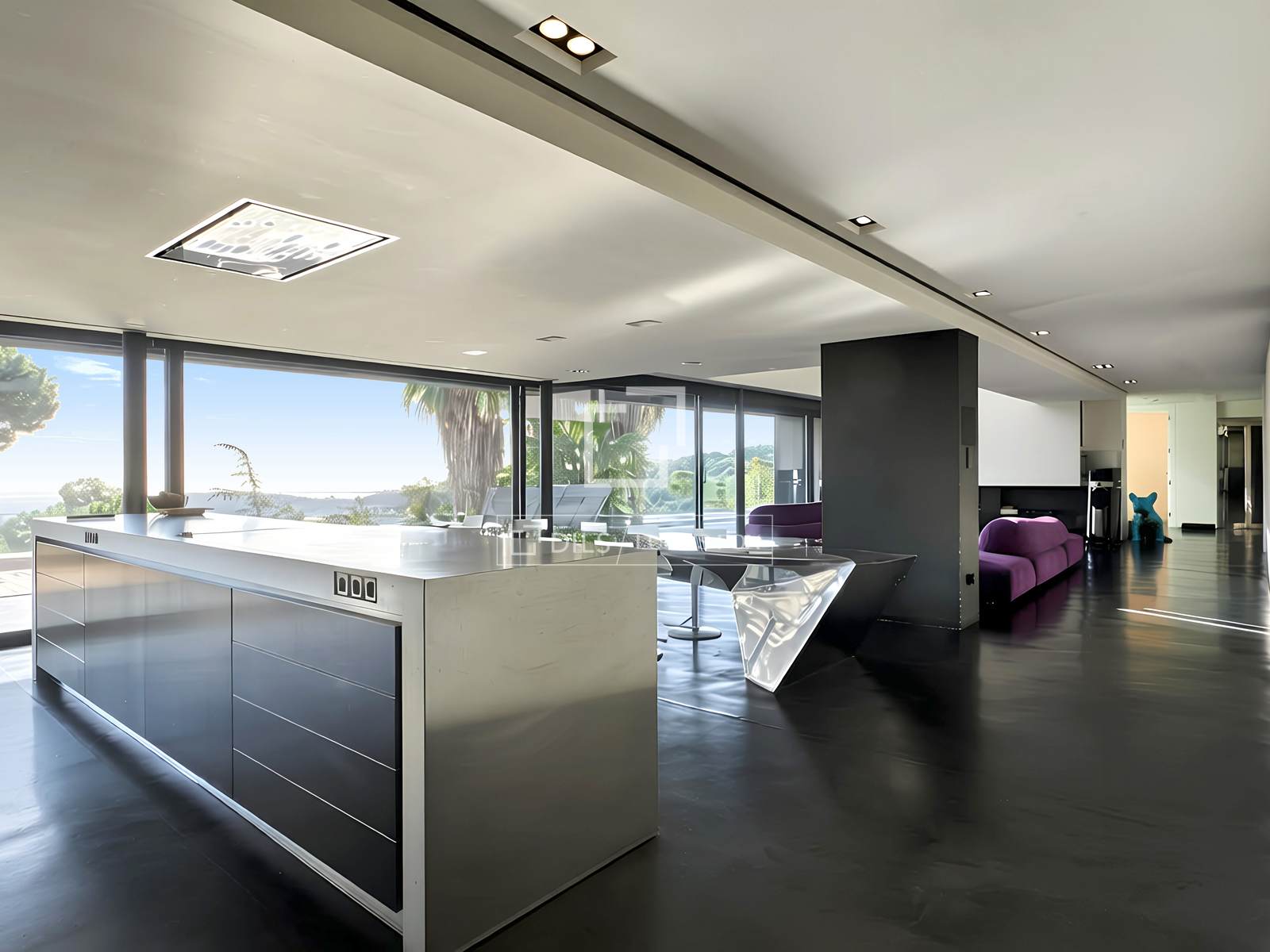 Saló i menjador de planta oberta amb vidres del terra al sostre