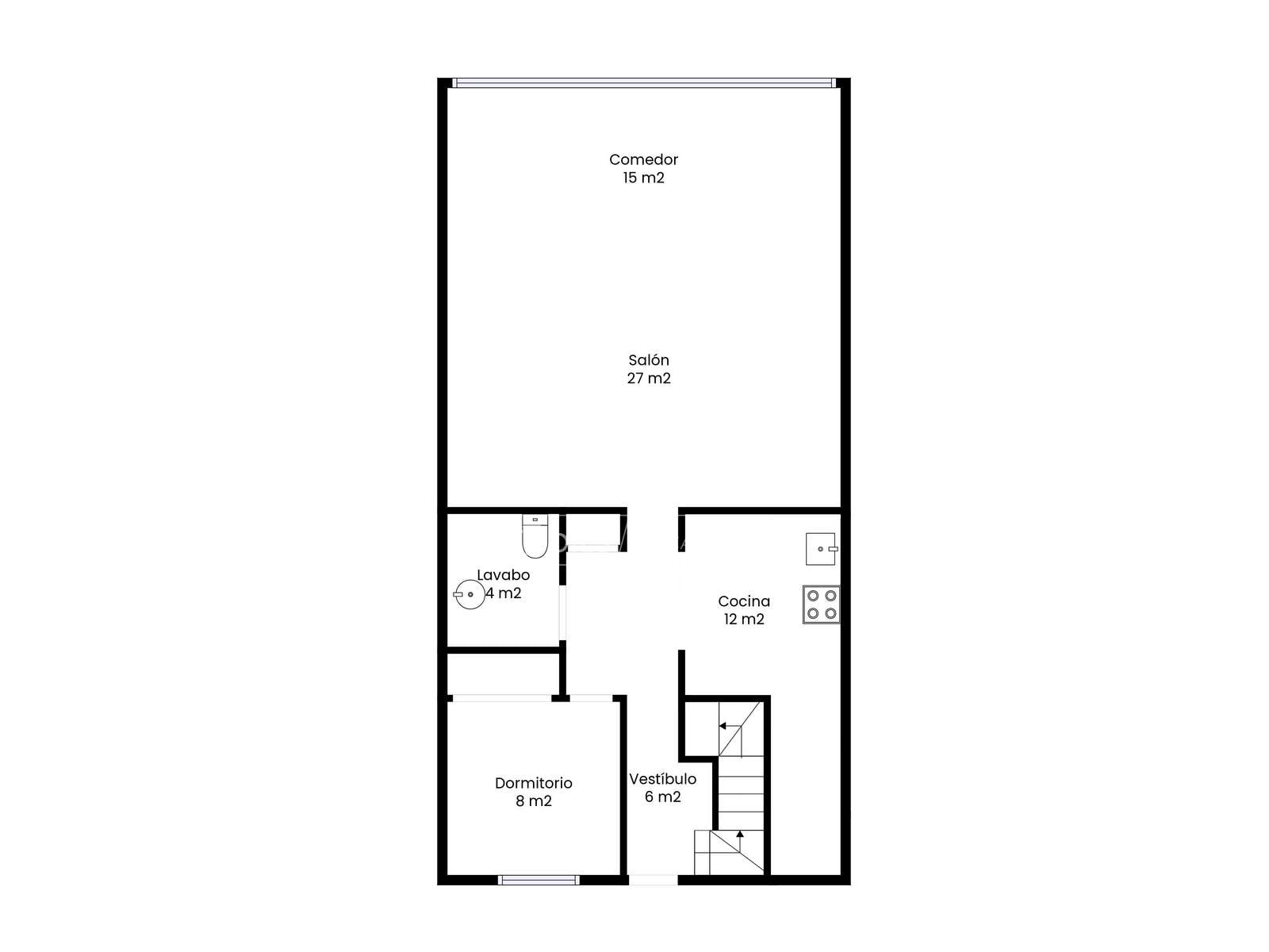 La planta principal acull la zona de dia amb un ampli saló i cuina en concepte obert, creant un ambient fluid, funcional i lluminós. En aquest mateix nivell trobem un dormitori i un lavabo de cortesia, ideal per a convidats o per a un ús flexible de lespai.