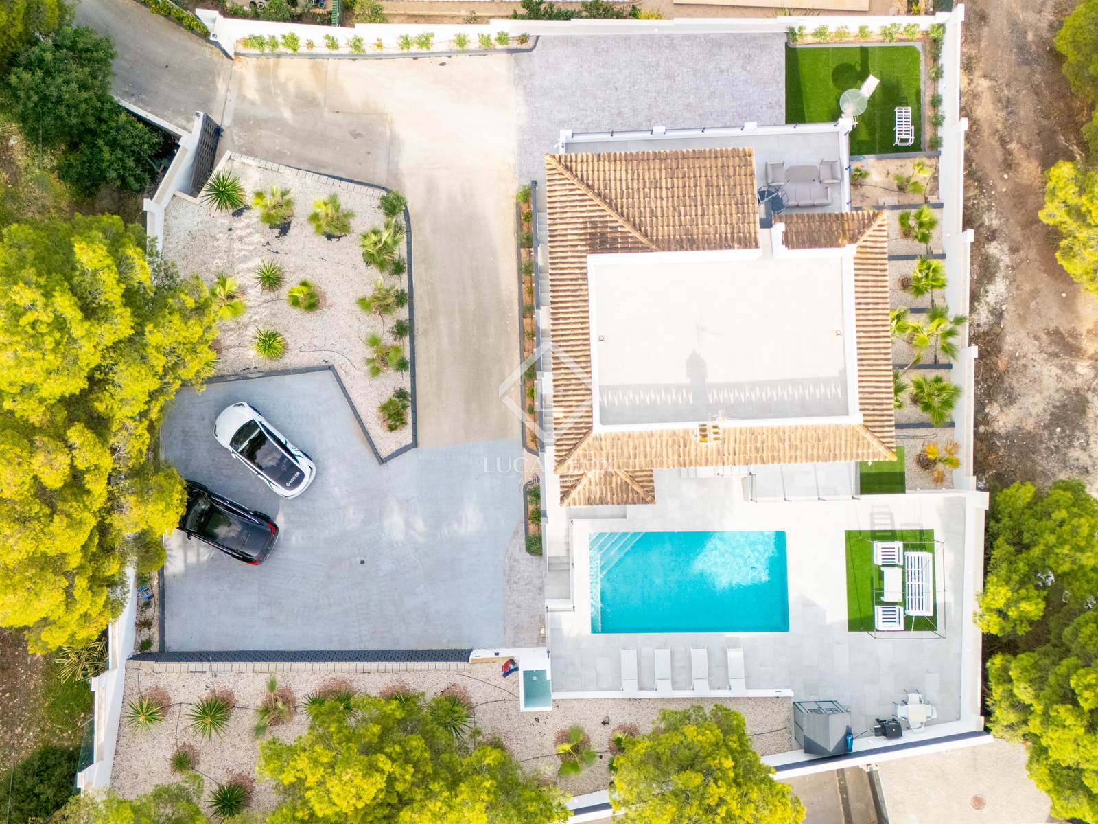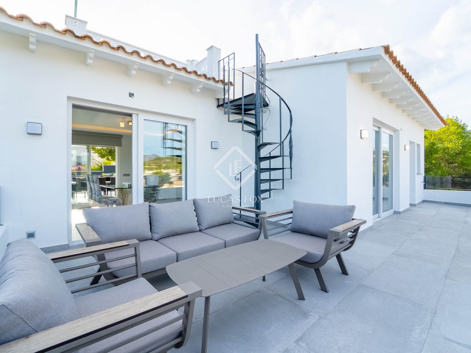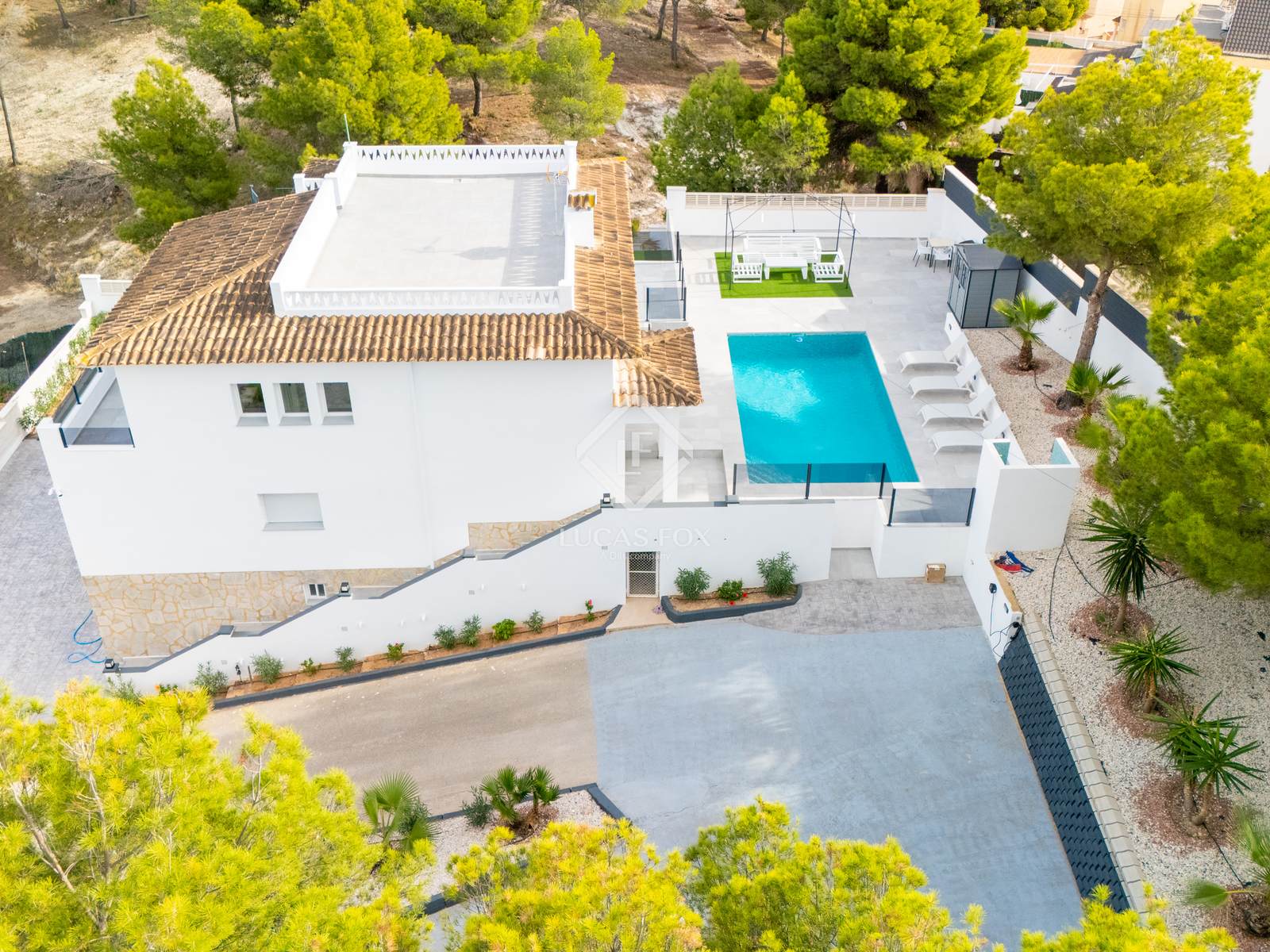 La zona exterior ofereix una gran piscina privada, àrea de barbacoa i múltiples racons per relaxar-se. Al terrat, el solàrium regala vistes panoràmiques espectaculars que converteixen cada capvespre en un moment especial.