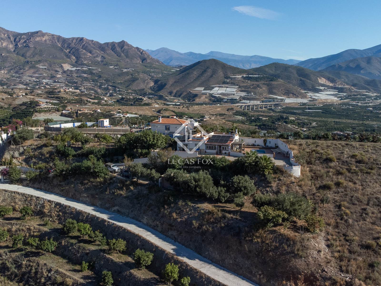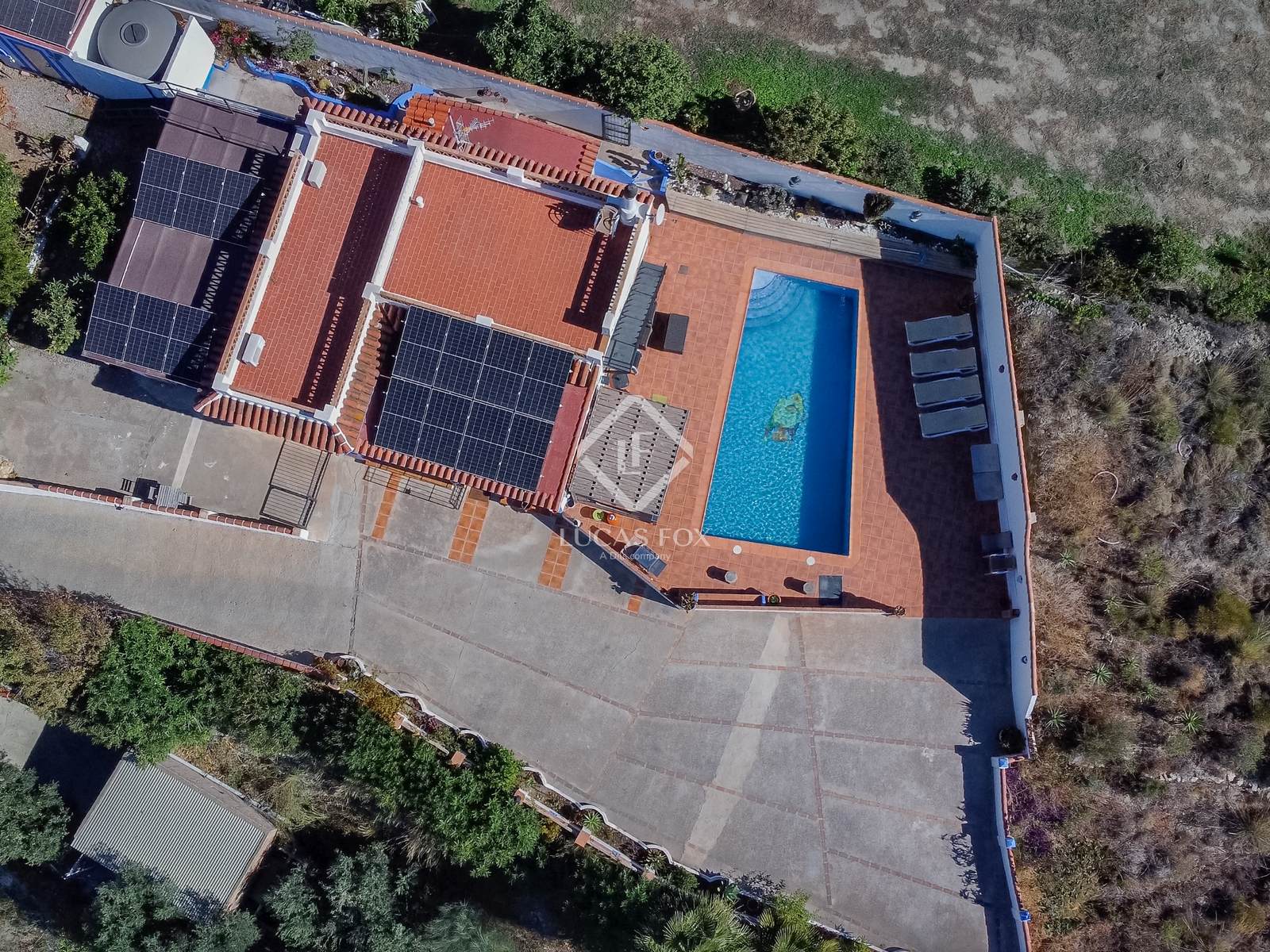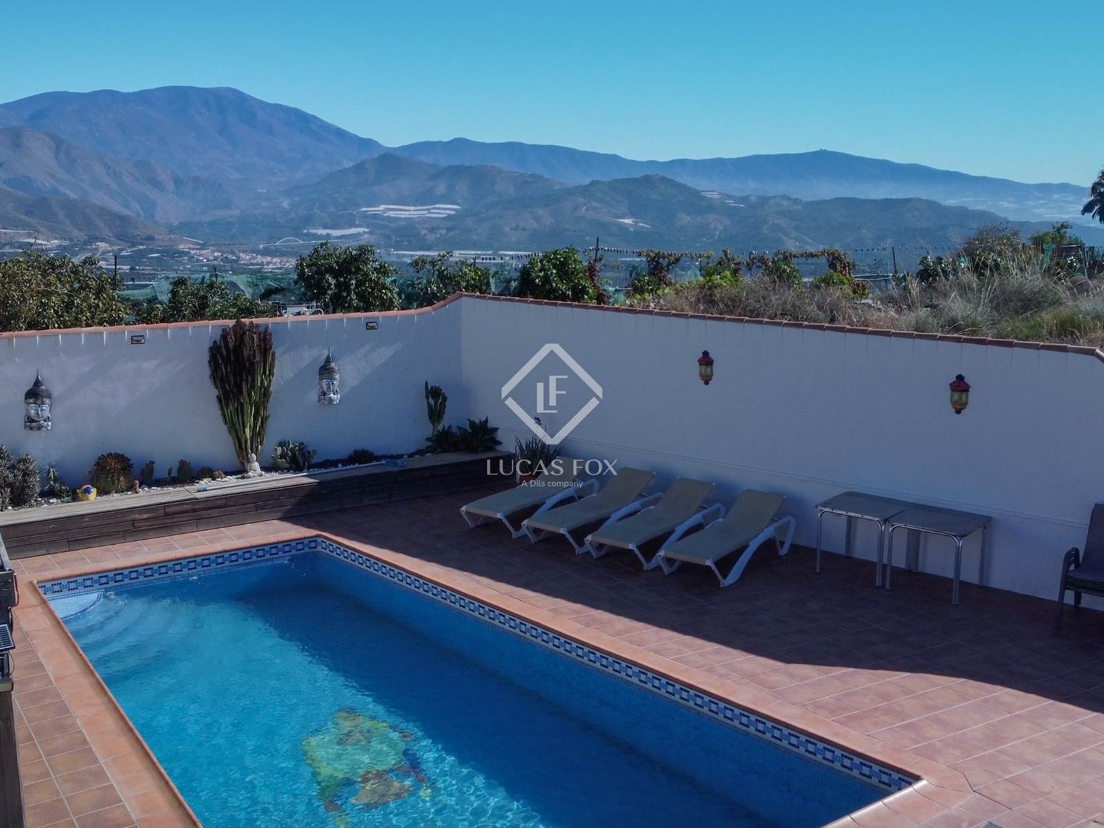 A l'exterior, hi ha una bonica zona amb una pèrgola i una piscina amb bany propi, envoltada d'espais verds i d'arbres fruiters tropicals com mànecs, llimones, mandarines, alvocats i moltes altres espècies pròpies de la Costa Tropical de Granada.