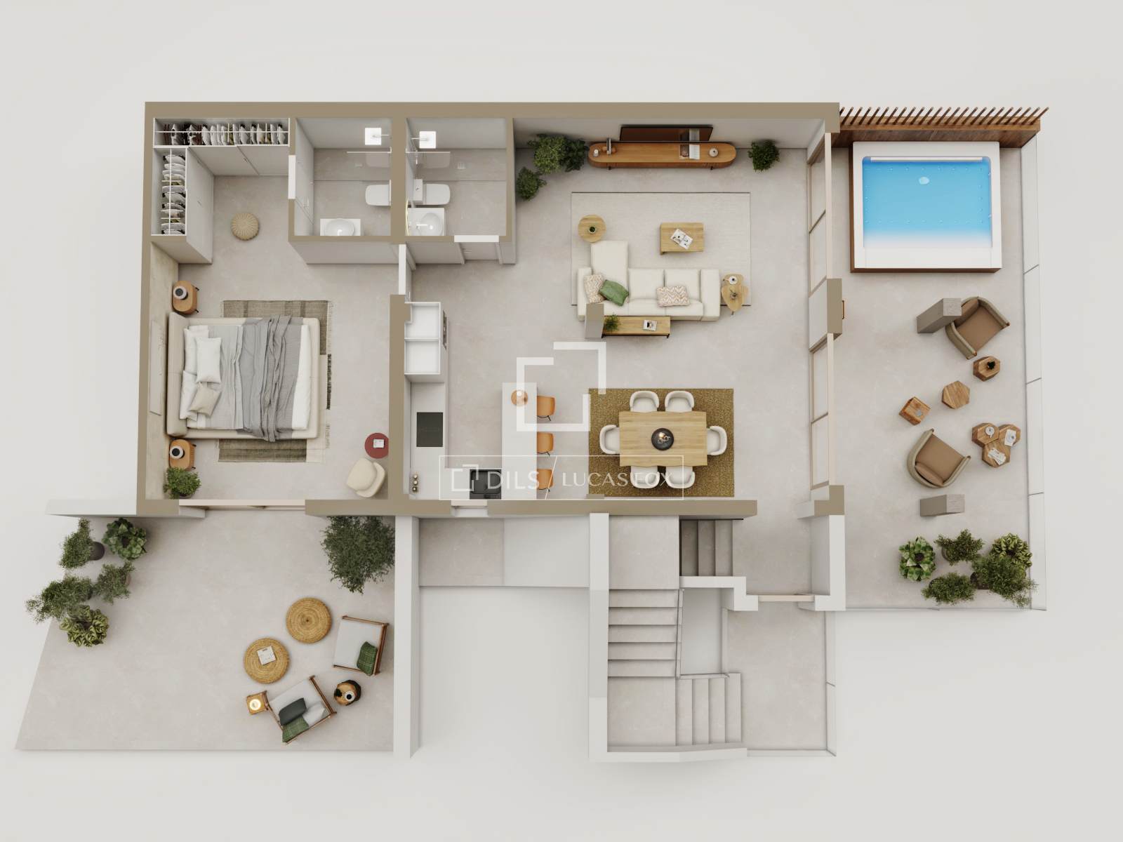Els interiors estan disposats acuradament per millorar la llum natural, el confort i la funcionalitat, amb una separació clara entre les zones d'estar i les de dormir. Els espais de la sala d'estar i la cuina estan dissenyats com el focus central de cada habitatge, oferint una sensació d'obertura, practicitat i, sempre que sigui possible, accés directe a zones exteriors com ara terrasses i patis que amplien l'espai habitable i enforteixen la connexió amb l'entorn.