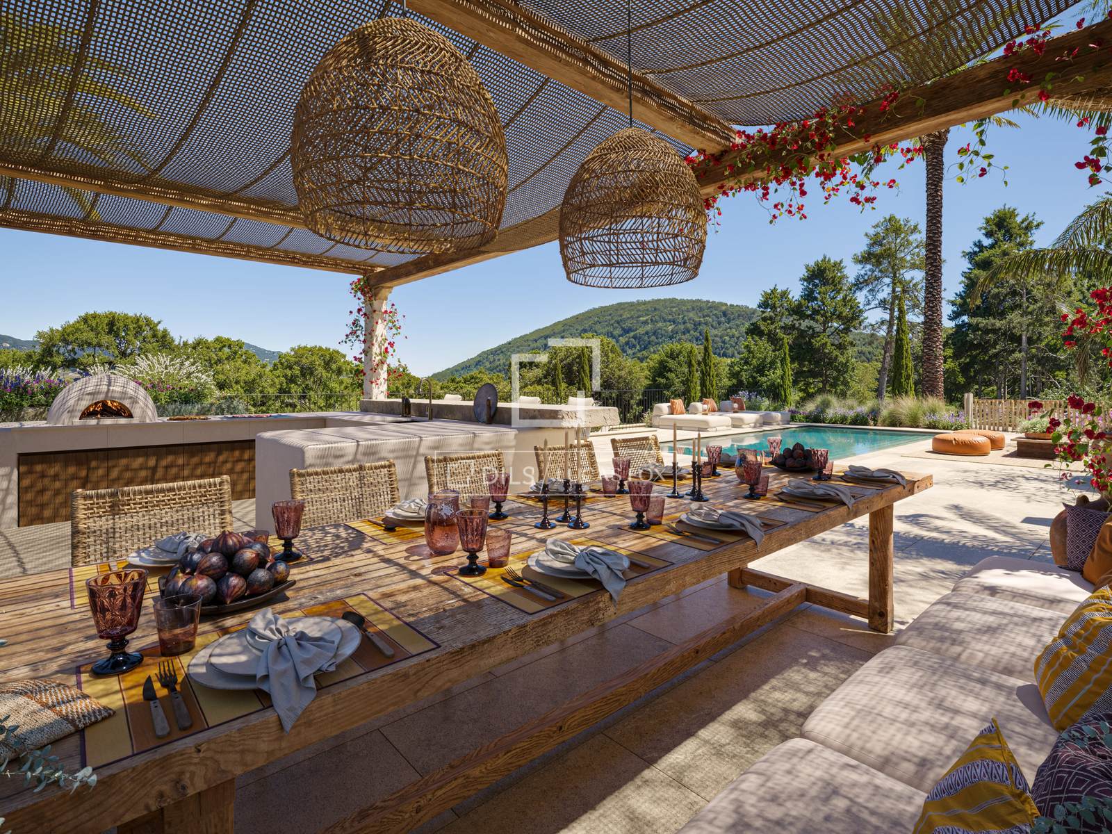 L´àrea exterior d´aquesta vila és un veritable oasi. Una piscina infinita de disseny elegant forma el cor del jardí, envoltada de palmeres i vegetació mediterrània. Diverses zones de lounge conviden a relaxar-vos al sol o prendre un còctel al vespre. La cuina exterior amb pèrgola i taula de menjador és l'escenari per a llargues nits d'estiu amb amics o família. Aquí es viu a l'aire lliure com si fos la teva sala d'estar. Amb vista a la vall i la natura circumdant, et sents en un paradís privat, lluny de l'enrenou però prop de tot el que necessites. Gràcies a una arquitectura paisatgística curosa, el jardí es manté íntim i amb ambient, amb racons per desconnectar, connectar o simplement gaudir del moment. Aquesta vila no és una casa, és un estil de vida. El terreny està excavat en un 90%, per la qual cosa un cop completat el darrer 10%, pots començar a construir immediatament.