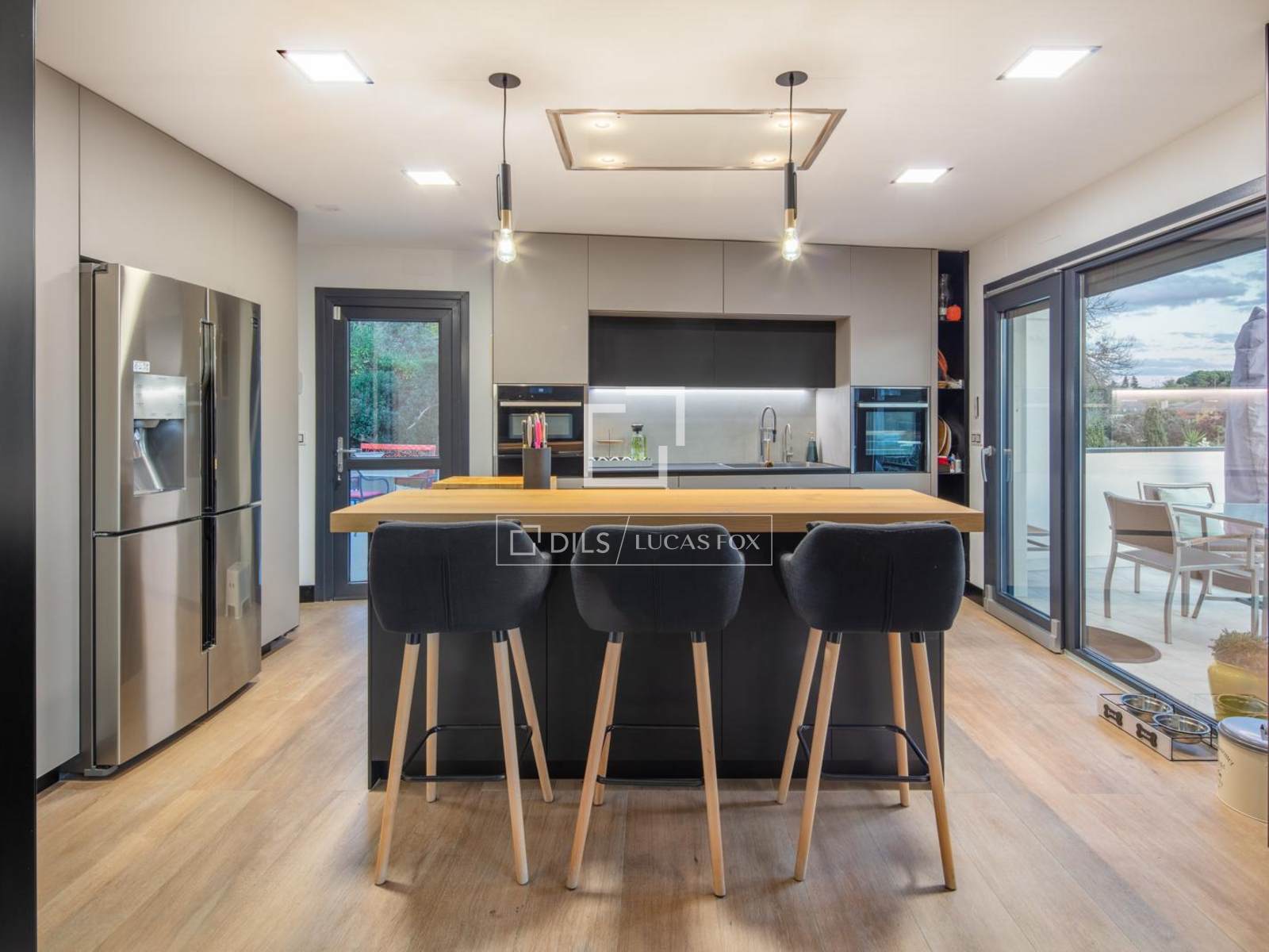 La planta inferior alberga un segon gran saló amb cuina integrada, ideal com a zona independent o d'oci, junt amb dos dormitoris addicionals i un bany complet. Es completa amb una zona multiusos (gimnasio, jocs), quart d'instal·lacions, lavadero-planchador i garatge amb capacitat per a dos vehicles. Des d'aquesta planta s'accedeix a un ampli porxo connectat directament amb la piscina de 4x10 m amb cloració salina, generant un espai perfecte per al disfrute exterior durant tot l'any.