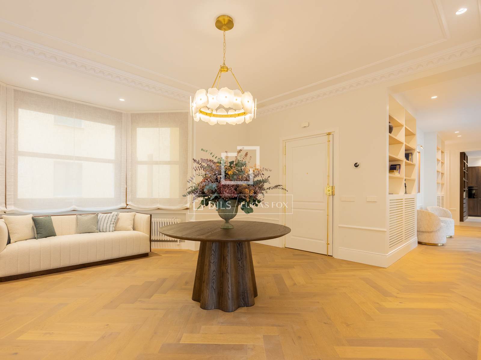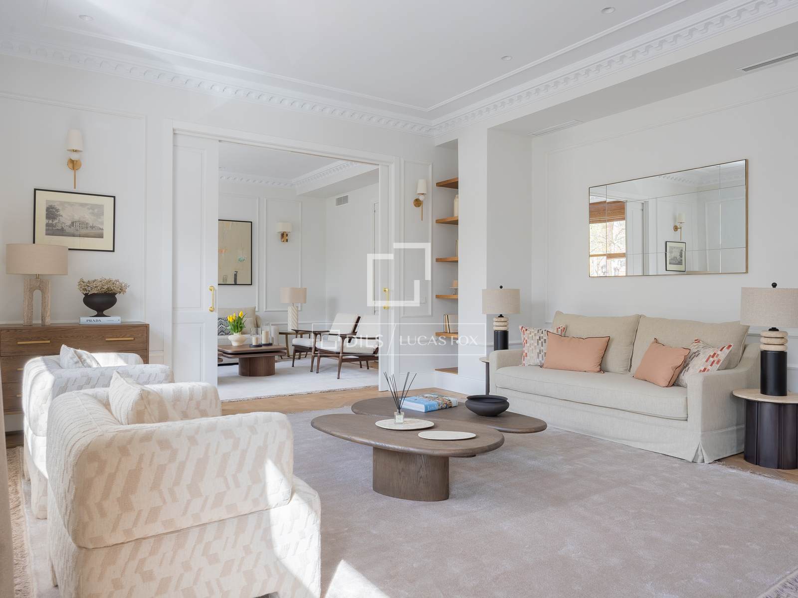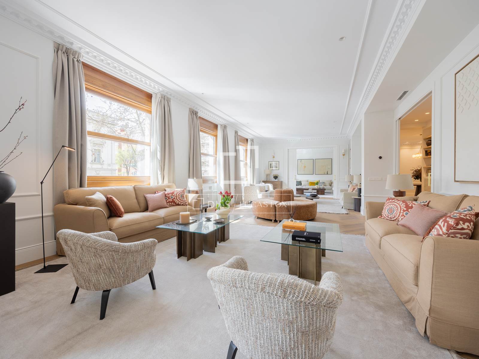 Ubicat en una primera planta amb alçada de segona, el pis gaudeix de vistes completament clares cap a l'Ambaixada d'Itàlia, cosa que aporta lluminositat, amplitud i una privadesa poc habitual a la zona. L'habitatge, íntegrament reformat amb un disseny contemporani i atemporal, compta amb 451 m² distribuïts en tres elegants zones de saló, un ampli menjador, cuina semiintegrada i quatre amplis dormitoris en suite, destacant la suite principal, que disposa de dos vestidors i dos banys independents.