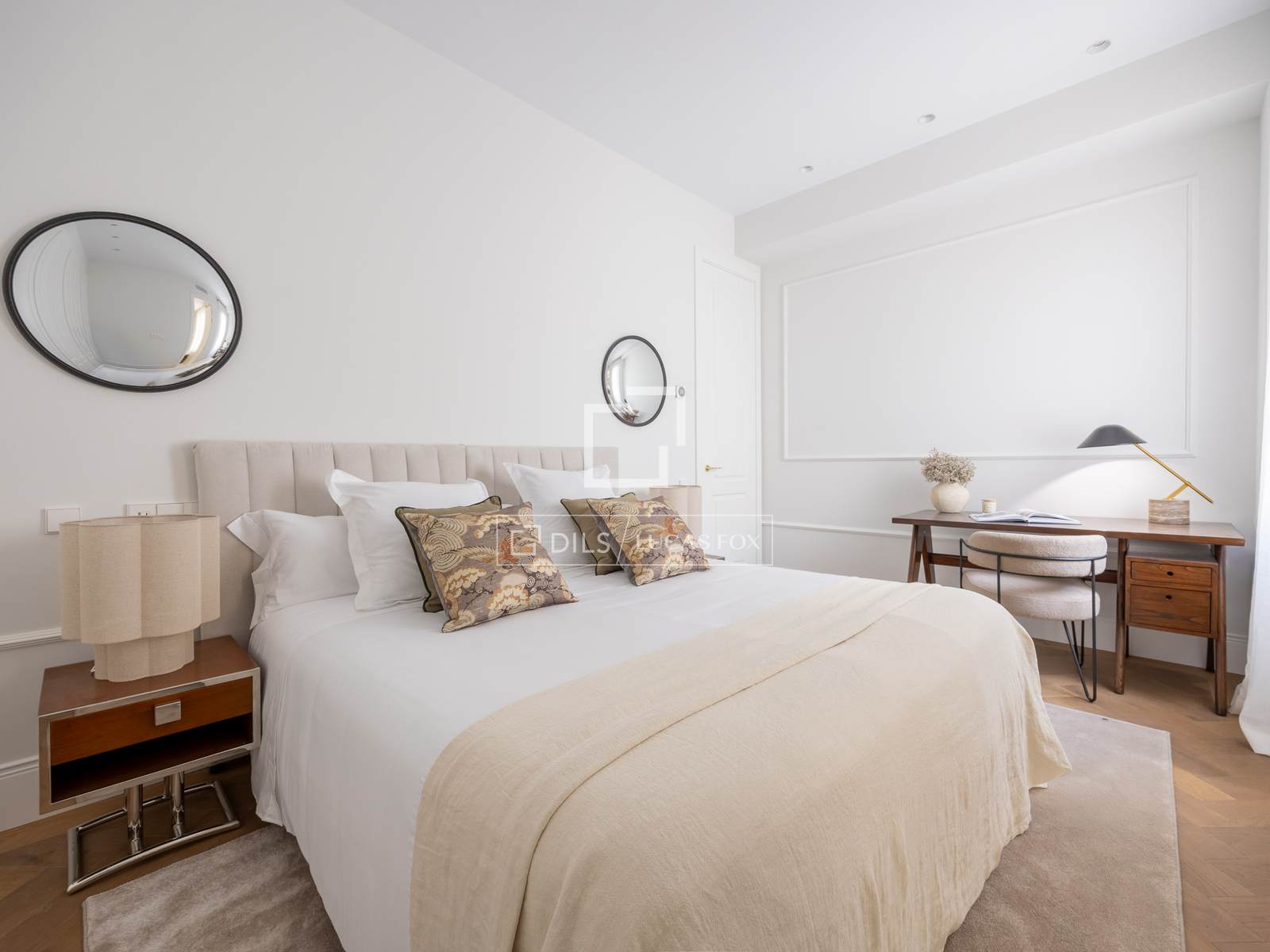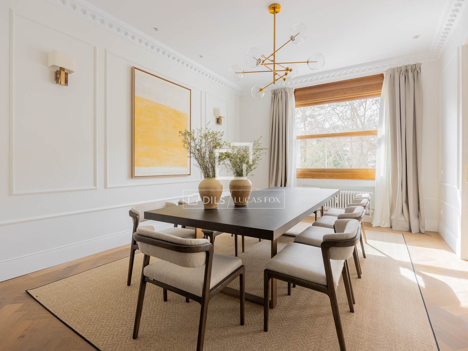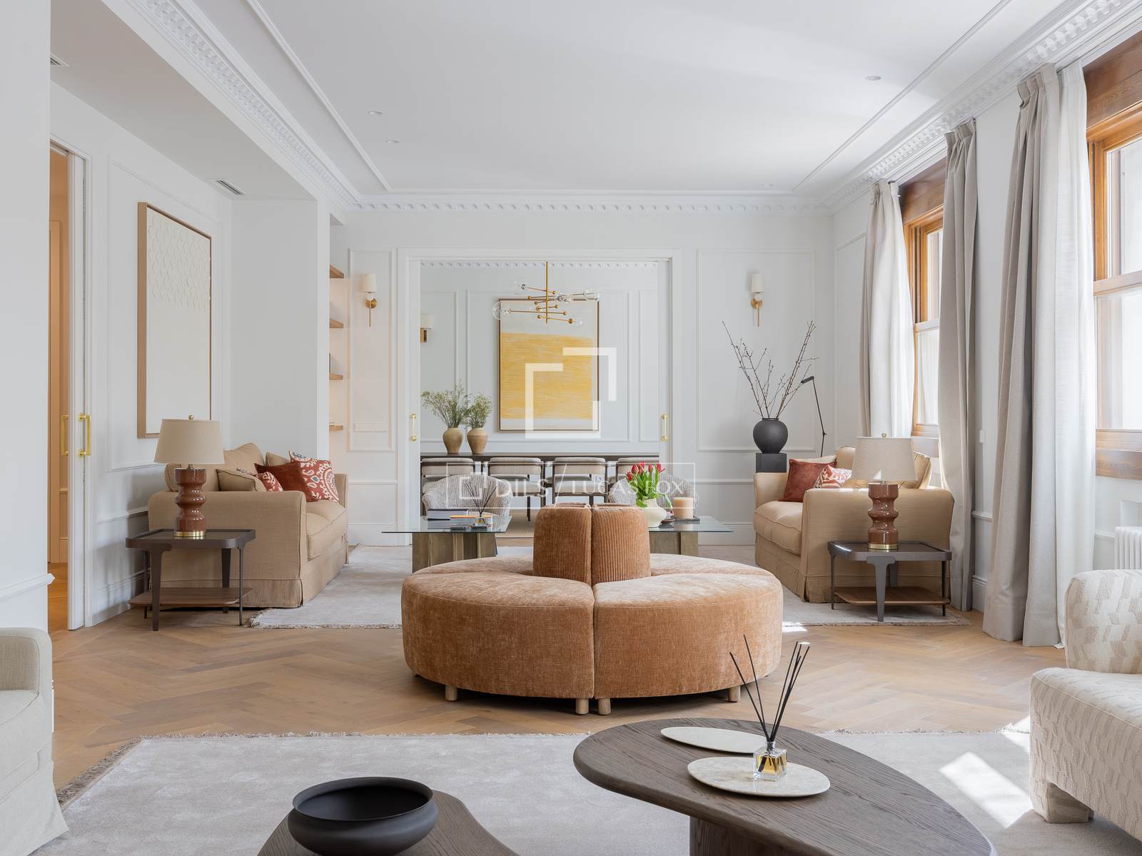 Ubicat en una primera planta amb alçada de segona, el pis gaudeix de vistes completament clares cap a l'Ambaixada d'Itàlia, cosa que aporta lluminositat, amplitud i una privadesa poc habitual a la zona. L'habitatge, íntegrament reformat amb un disseny contemporani i atemporal, compta amb 451 m² distribuïts en tres elegants zones de saló, un ampli menjador, cuina semiintegrada i quatre amplis dormitoris en suite, destacant la suite principal, que disposa de dos vestidors i dos banys independents.